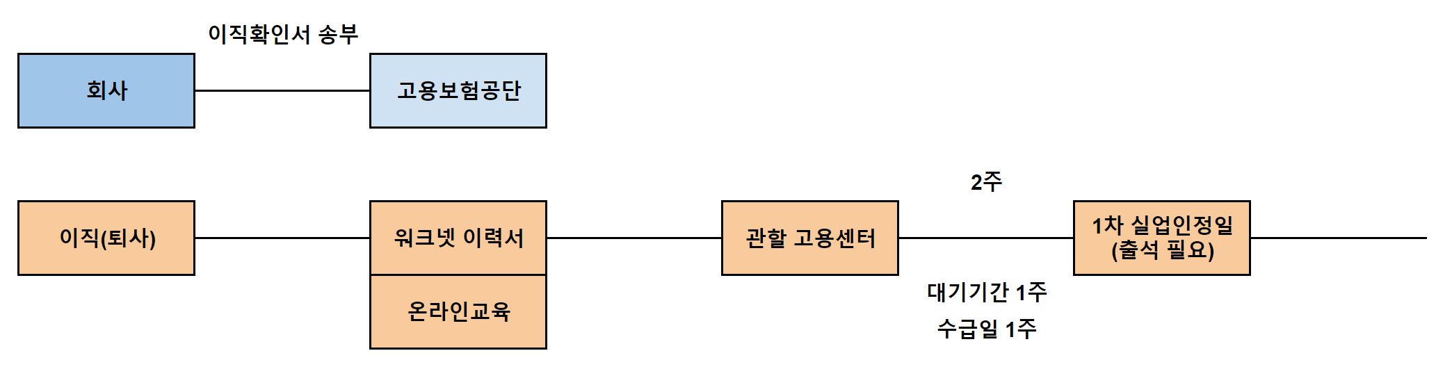 1차 실업급여는 2주의 기간 중 1주일에 해당하는 부분만 입금된다. 이는 첫 1주를 대기기간으로 계산해 제외한 것이며, 다음 실업급여부터는 4주 단위로 실업급여를 온전히 수령하게 된다.