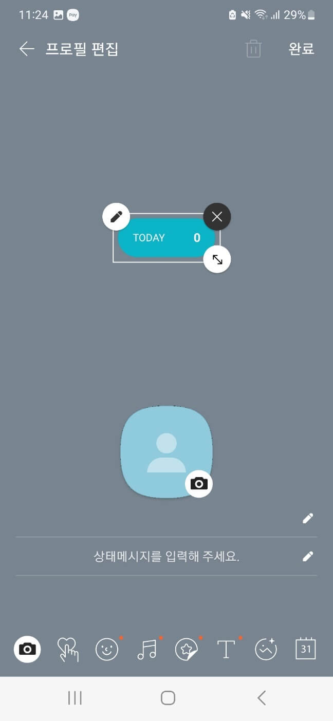 - 프로필 상에서 방문자 위젯 위치 또는 크기 조절후 우측 상단의 [완료] 클릭