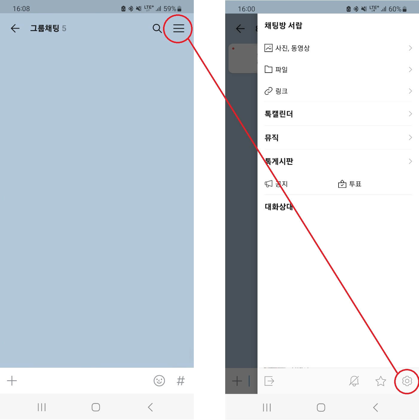 - 단톡방 우측 상단의 가로줄 세개 메뉴 클릭