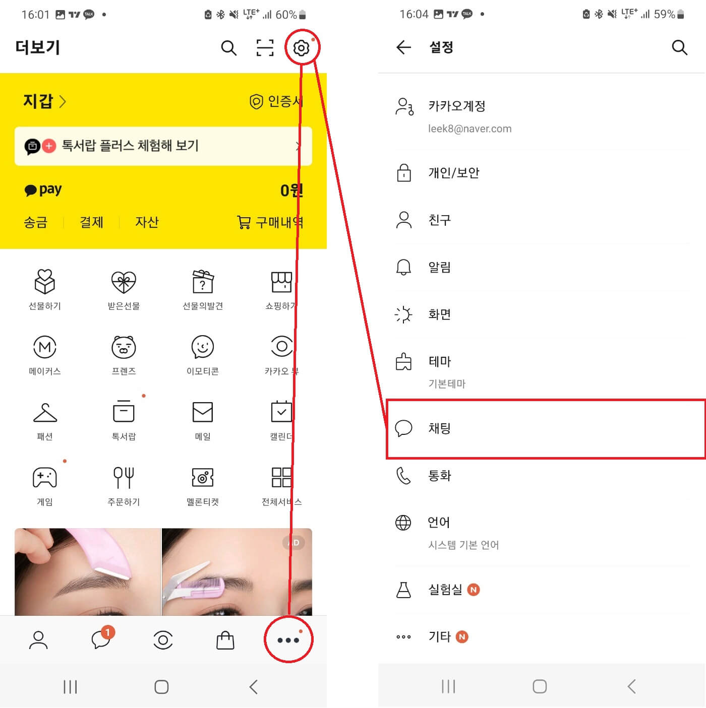 제일 먼저 카카오톡 하단의 점 세개 모양의 메뉴를 눌러준다. 다음에는 우측 상단의 톱니바퀴 모양의 아이콘을 눌러 [설정]메뉴로 들어가준다. 그 다음에는 채팅 메뉴를 눌러준다.