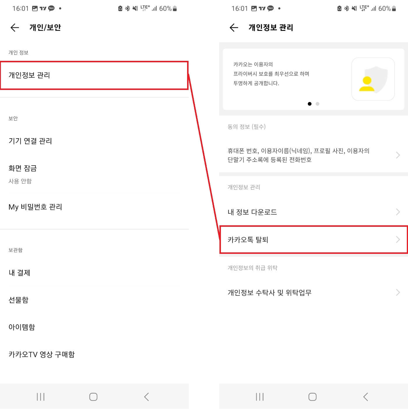 그 다음에는 [개인정보 관리]를 눌러준다. 그 다음에는 [카카오톡 탈퇴]를 눌러준다.