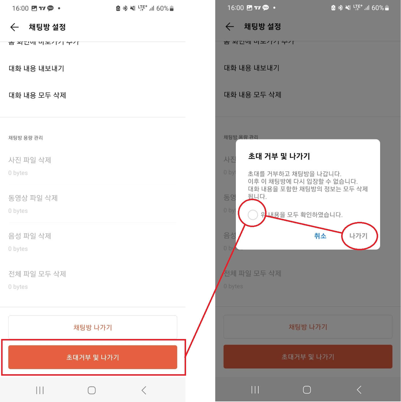 - 메뉴 맨 밑의 [초대거부 및 나가기] 클릭