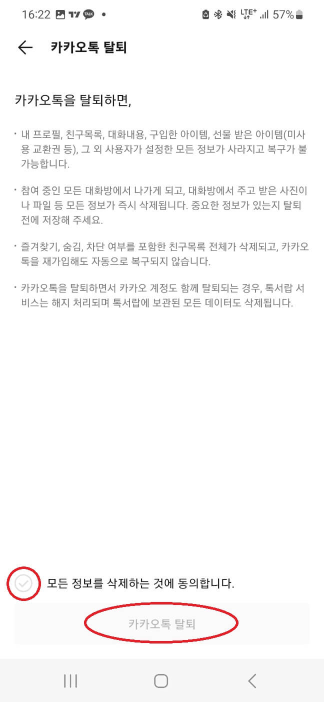 - 주의 메시지 확인 후 동의를 체크하고 하단의 [카카오톡 탈퇴]를 눌러준다.